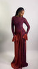 • Silhouette: Fitted bodice, gathered hip drape with thigh-high slit